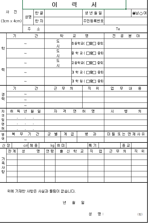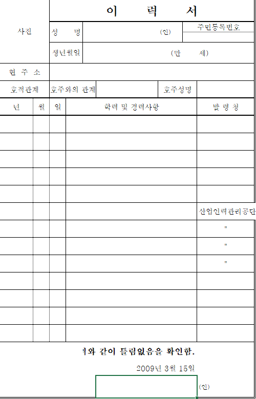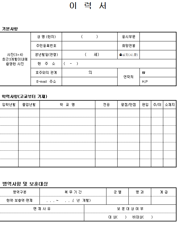 이건 두 번째 양식입니다. 위와 아래의 양식이 아예 다르니 확인하셔서 필요하신 이력서를 사용하시기 바랍니다.