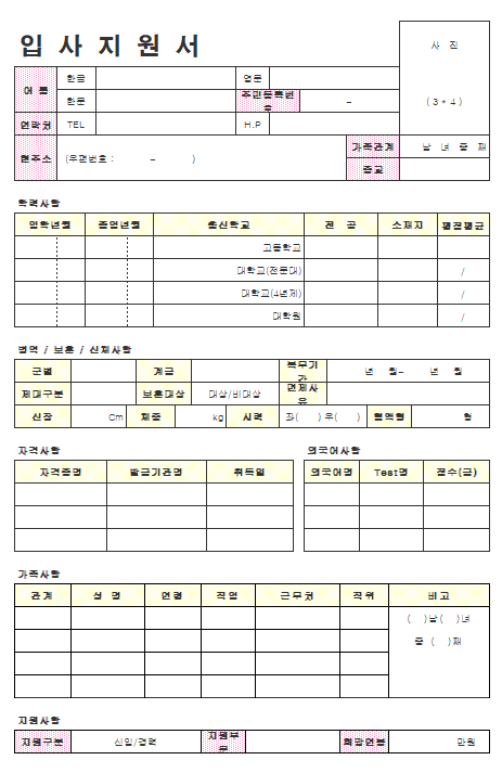 회사에 입사할 때 쓰이는 입사지원용 이력서입니다. 이름, 연락처, 자격사항, 가족사항, 학교 등을 적으면 되고, 자기소개서도 간단히 적을 수 있는 양식이 마련되어 있습니다.