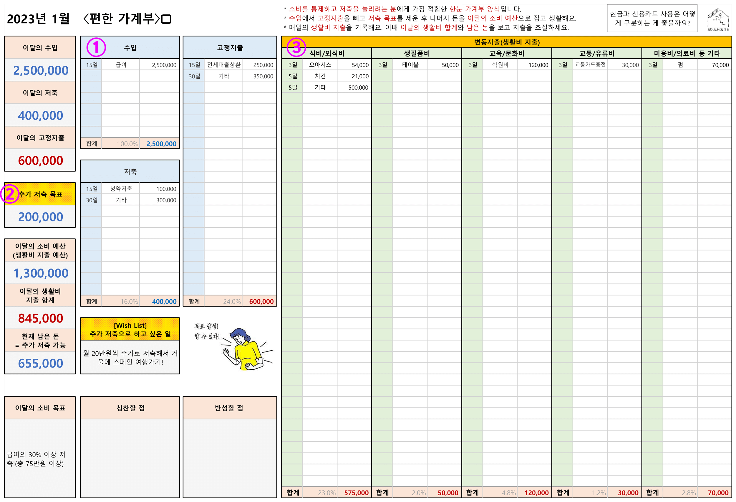 하루 3분 정도 소비하여 가계부를 작성하면서 본인이 원하는 돈을 저축하고 목표를 실천해보시기 바랍니다. pc 다운로드하시면 됩니다.