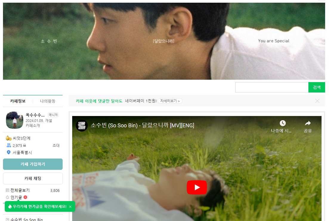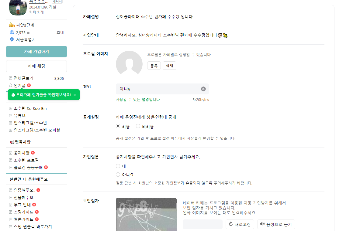 왼쪽 상단에 '카페 가입하기' 버튼을 클릭하시면 소수빈 팬카페 가입 페이지로 넘어갑니다